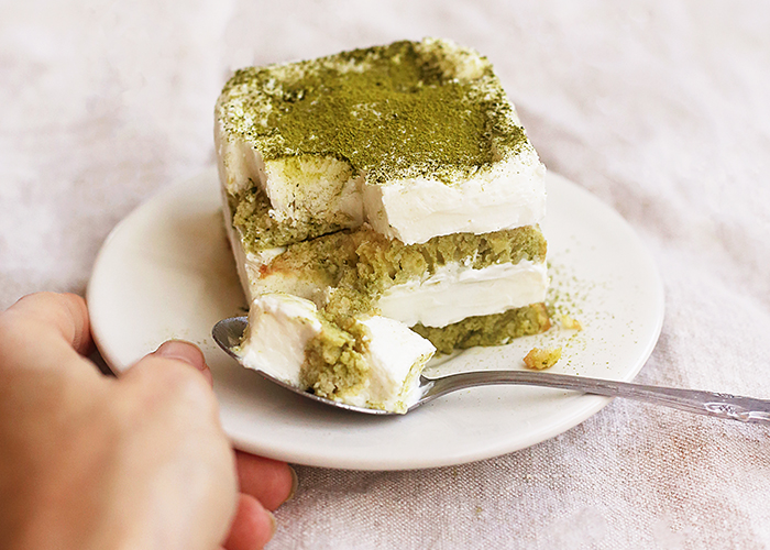 4) Whip remaining 1 cup of cream, mound on top, dust generously with matcha powder, optional: garnish with Madeleine crumb.