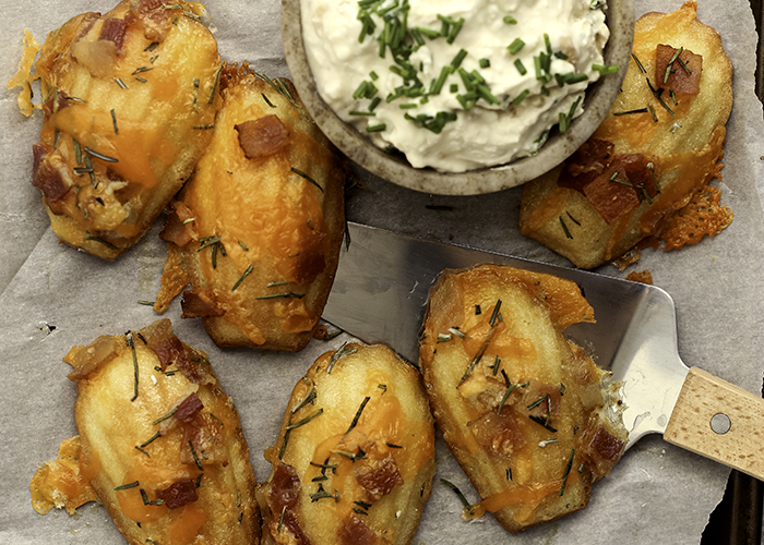 2) Stir in cream; reduce heat and simmer until potatoes are tender, about 30 minutes. 3) Using a medium sized skillet, cook bacon on medium heat until cooked through, about 7-10 minutes. Set aside until ready to assemble soup. 4) Cut each Madeleine into about 4-5 slices width-wise. Brush slightly with melted butter, and dip into grated parmesan cheese. Line a baking tray with parchment paper, and bake parmesan coated Madeleines at 350º F for 7 minutes, the parm should be nice and crispy and golden. Set aside to cool slightly once done and start to assemble soup, top with bacon bits, toasted parm Madeleines, and chives.