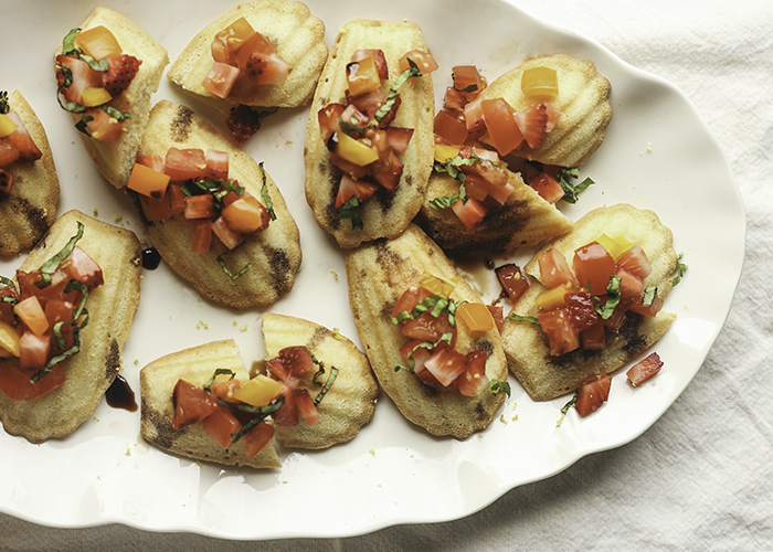 - 12 Cinnamon Brown Sugar Mini Cakes*, toasted, cut into 4-6 cubes per Madeleine